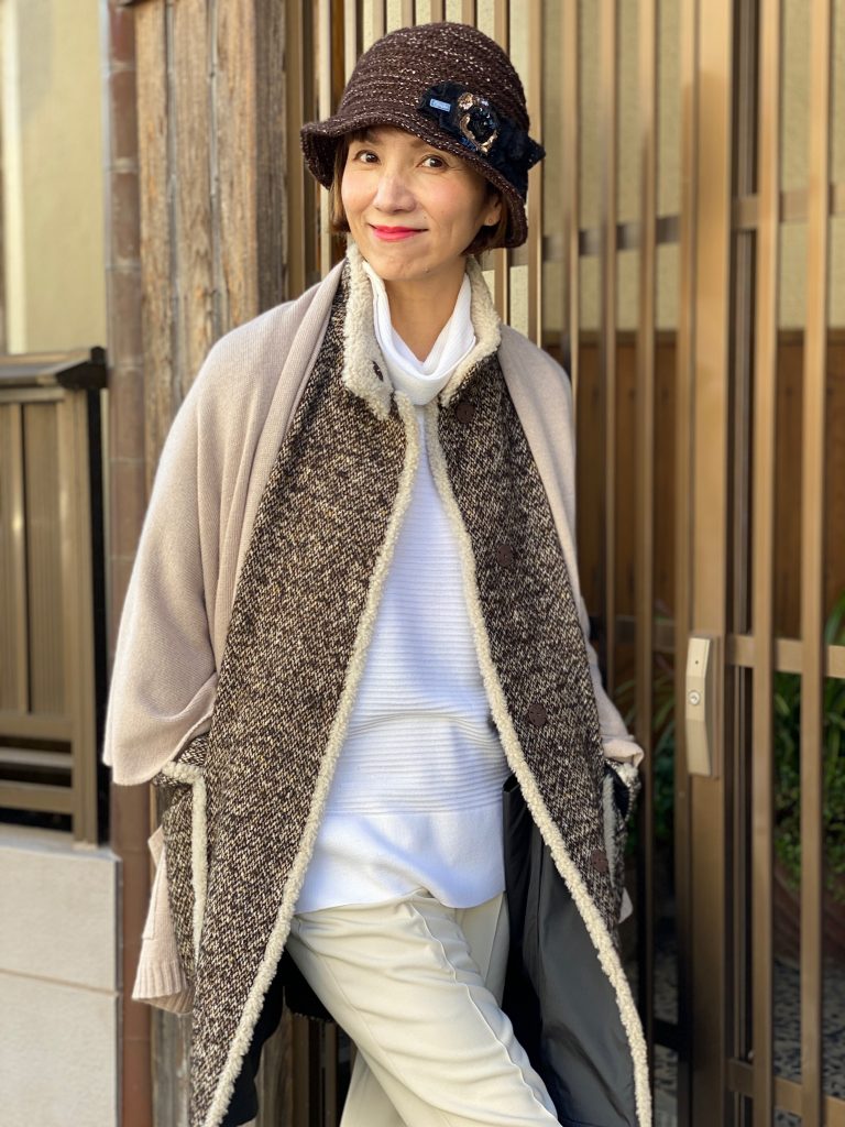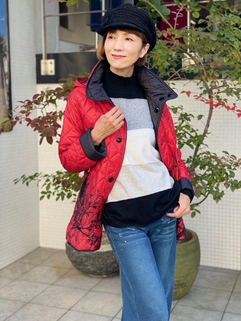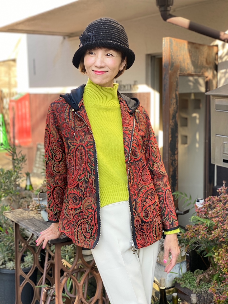 ジャケット:ランディー品番690/ニット:Rosanna(ロザンナ)52489(黒)/パンツ:伊太利屋618224/帽子:コンプリット21166